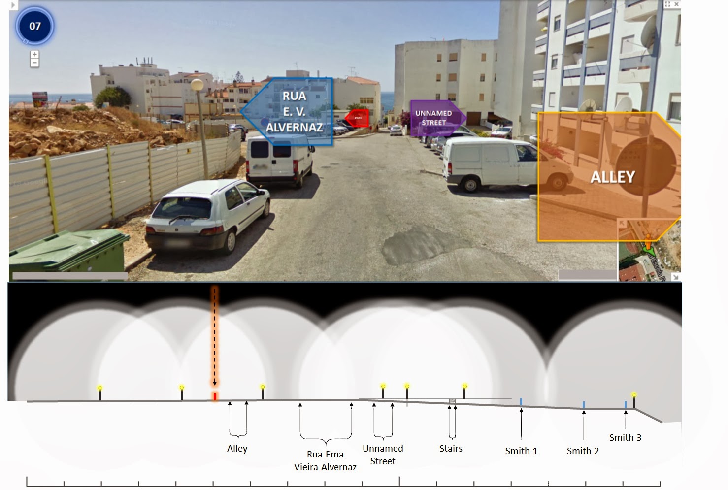 We have signalled, from left to right, an alley, Rua Ema Vieira Alvernaz, an unnamed street, stairs and the 3 locations of Smith's 3 groups, Smith 1, Smith 2 and Smith 3: