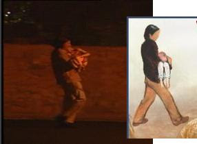 Now look at the man’s back. The inclination of the man’s body to compensate the weight of the he carries, which you forgot to remember at the time of your fake description. And the inclination of the child’s legs, in natural accordance with inclination, just mentioned, of the man’s body.