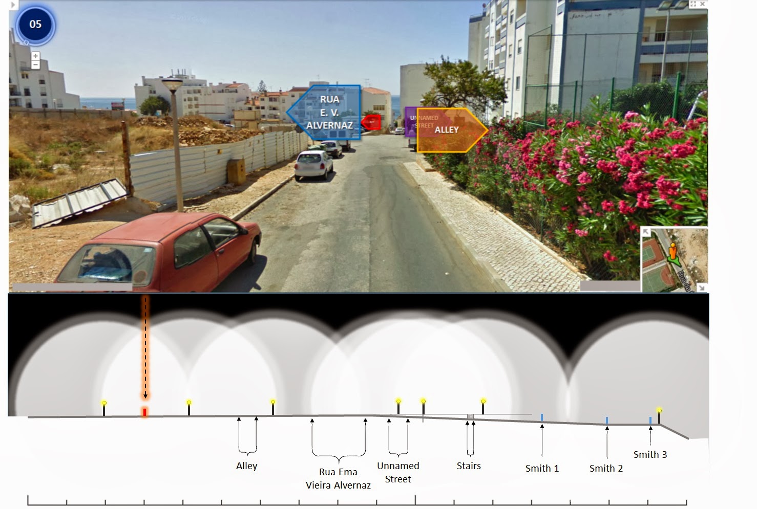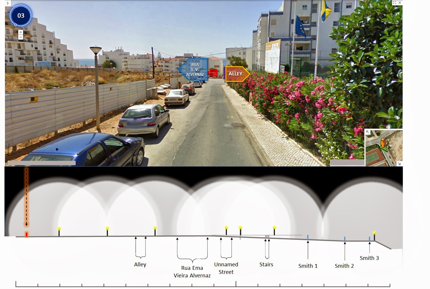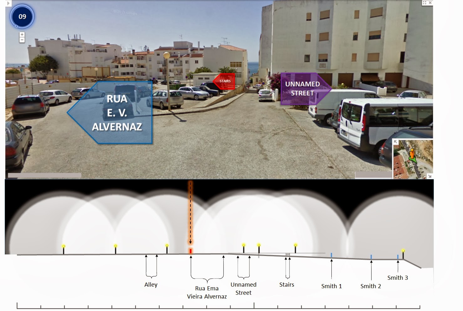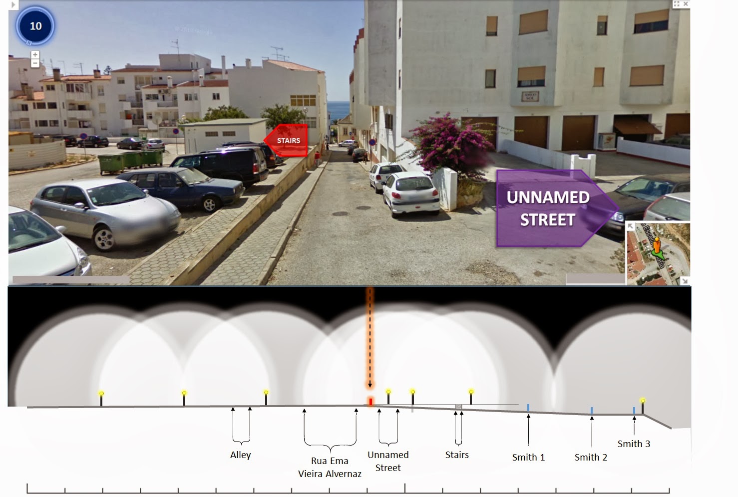 We have signalled, from left to right, an alley, Rua Ema Vieira Alvernaz, an unnamed street, stairs and the 3 locations of Smith's 3 groups, Smith 1, Smith 2 and Smith 3: