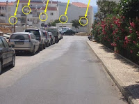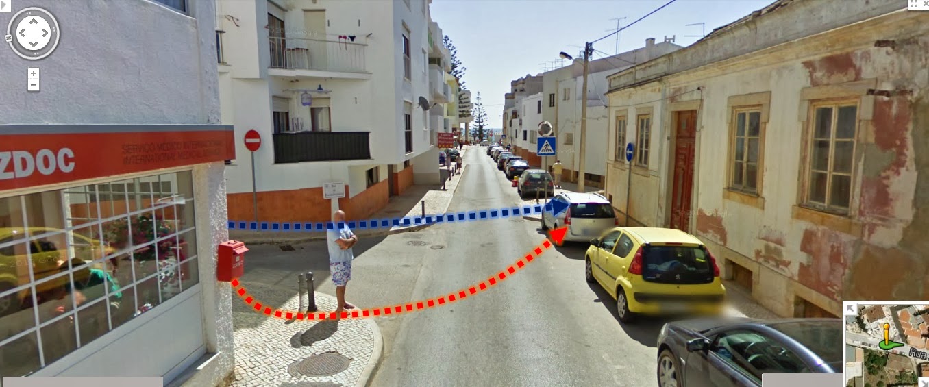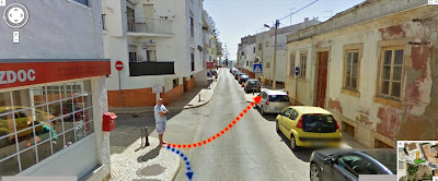 Scenario - I left apartment 5A via front door (parking area). Turned left on Rua Dr. Agostinho da Silva and walked all the way to the end. There, turned left on Rua Primeiro de Maio and immediately turned right on Rua da Escola Primária. This street curves first to the left then to the right and finally bifurcates.